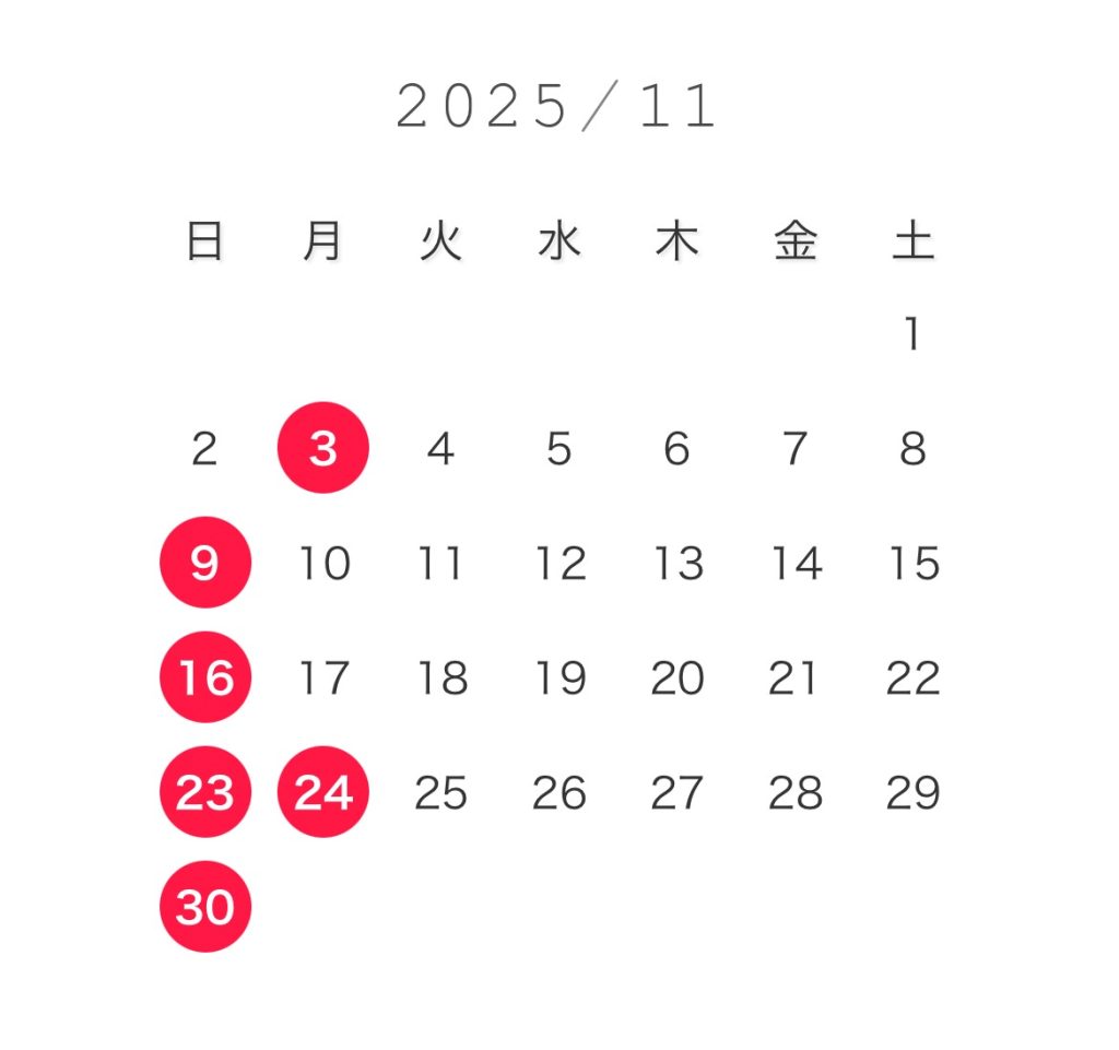 お知らせが遅くなりましたが、11月の休業日になります。